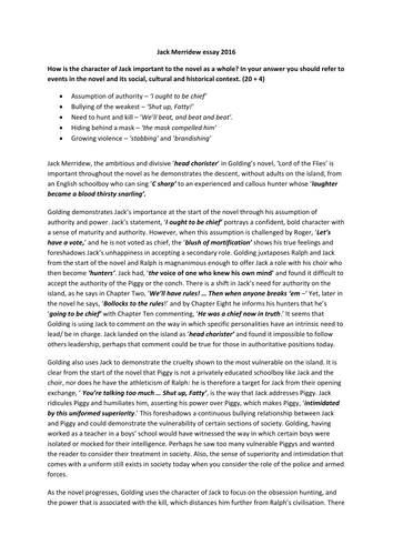 This shows how the boys are using the fear crested to justify their actions subconsciously. Lord of the Flies Critical Essay Outline Lord of the flies essay outline. Words: Category: Lord Of The Flies Pages: 2.